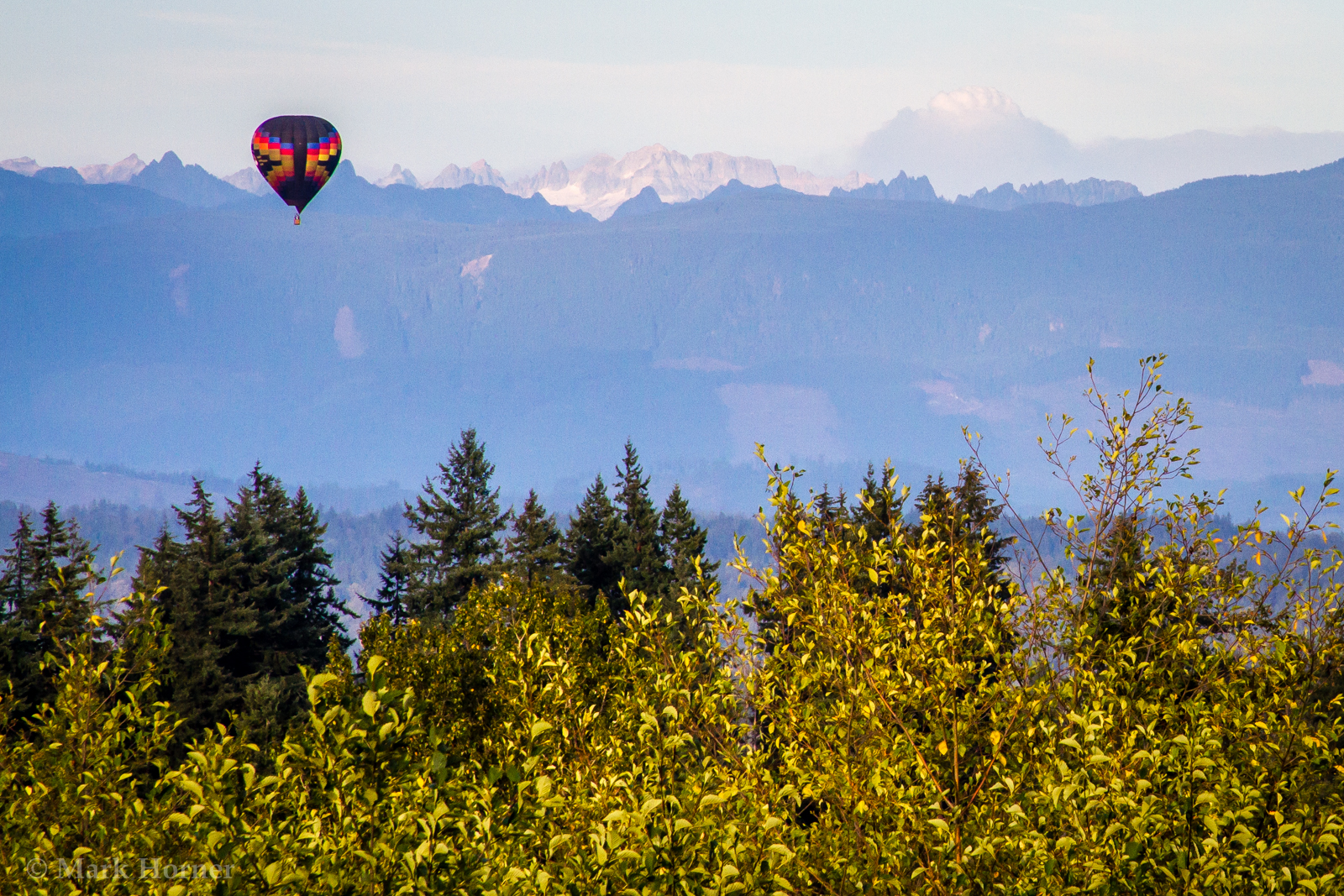 As the balloons rode the winds southward, the fire-borne clouds over the Cascades could be seen in the distance beyond them.