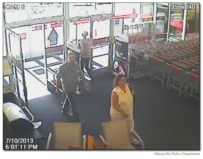Marysville police have released surveillance pictures that show the man wearing a gray buttoned shirt and a black bandana around his head. Police say the man is white, heavy set and about 6 feet tall.
